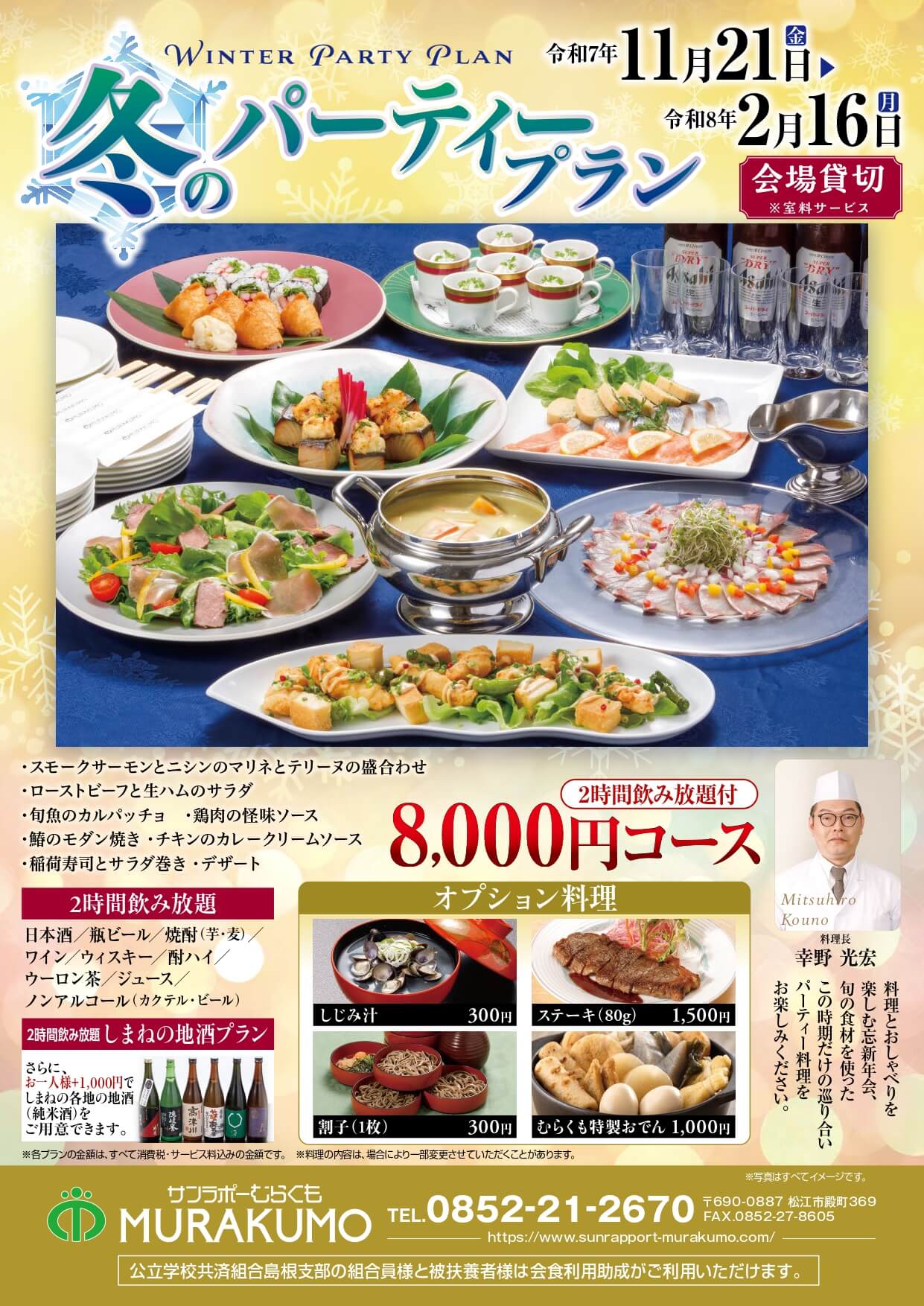 冬のパーティープランのご紹介です。 【期間】令和7年11月21日(金)~令和8年2月16日(月) 【お問い合わせ】TEL(0852)21-2670